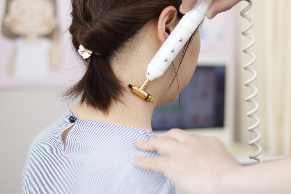 3〜999Hzの8種類の周波数から今ある痛みに最も効果のある周波数を選択し通電する施術です。経穴(ツボ)を使って関節的に流す方法と直接患部に流す2種類刺激で、消炎・鎮痛効果が期待できます。